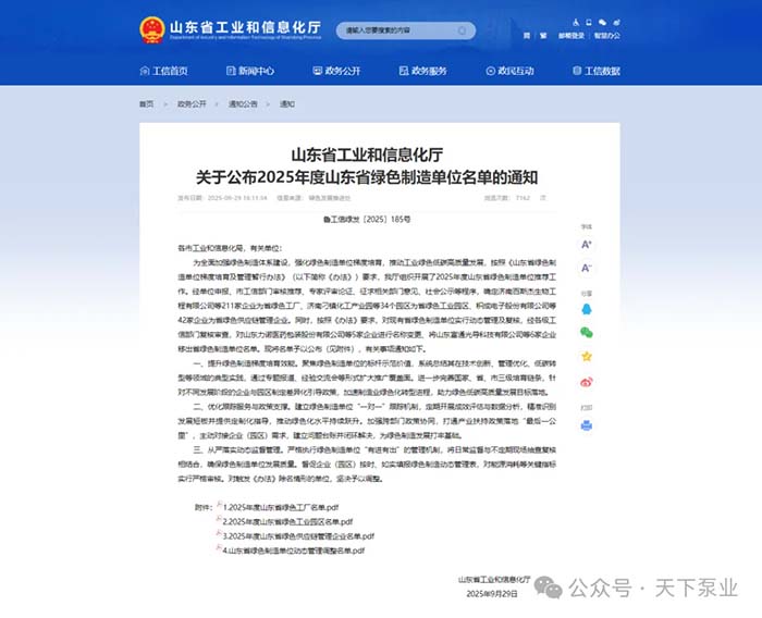 2025年9月29日,山东省工业和信息化厅公布2025年山东省绿色制造单位认定名单。荏原机械淄博有限公司凭其在绿色制造领域的卓越表现,成功入选“山东省绿色工厂”、“山东省绿色供应链管理企业”名单。此次入选,是山东省工信厅对荏原淄博在资源高效利用、生产过程绿色升级及节能措施创新等方面成果的充分认可。