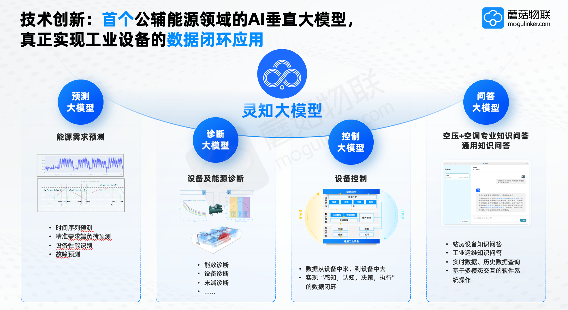合规落地 灵知AI的底气来自千厂实践。作为国内首个真正在公辅能源场景落地的垂直大模型,灵知AI能顺利通过备案,是蘑菇物联近10年沉淀的工业物联数据和专业运维报告,以及在60多个制造行业、6000多家工厂摸爬滚打的实战经验。与通用AI模型不同,灵知AI精准聚焦通用工业设备行业和公辅能源领域,不贪多求全,只深耕核心场景,核心覆盖问答、预测、诊断、控制四大能力场景,这也是其在备案审核中脱颖而出的关键特色。