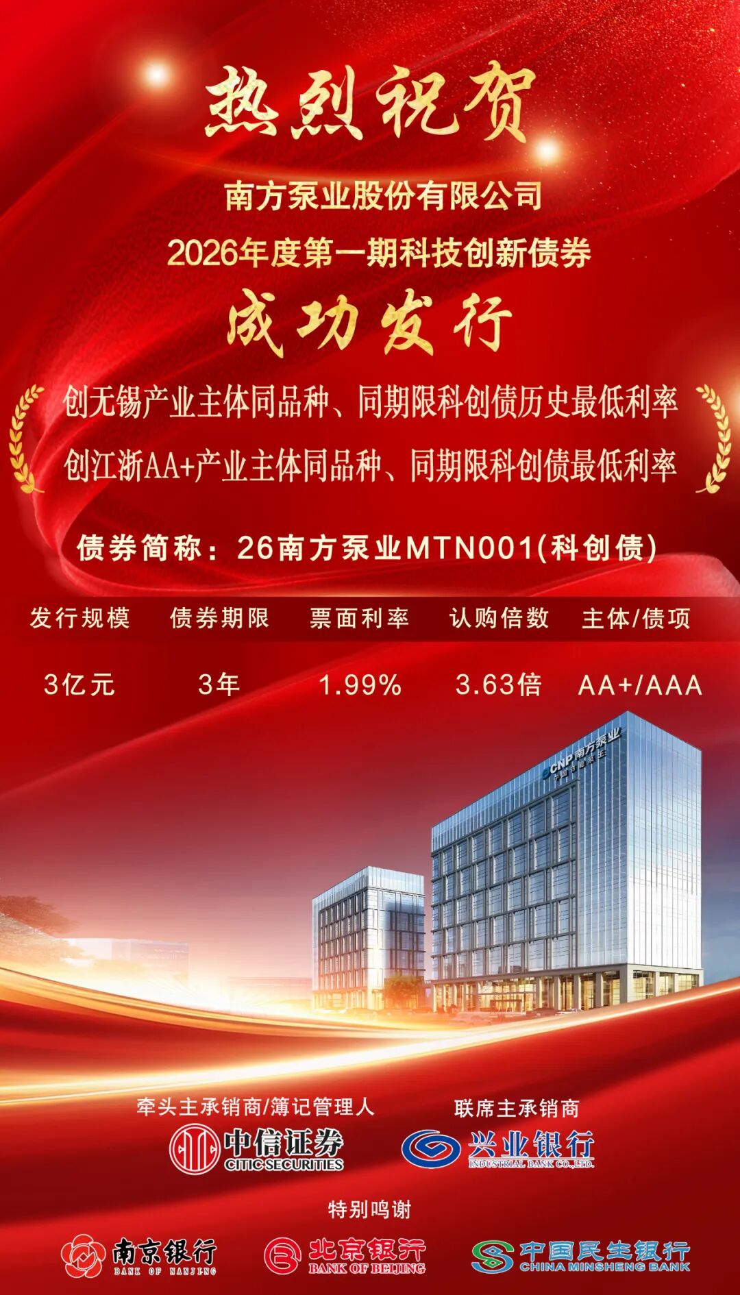 1月29日,南方泵业股份有限公司成功发行2026年度第一期科技创新债券{债券简称:26南方泵业MTN001(科创债)},规模3亿元,期限3年,票面利率1.99%,创无锡市产业主体同品种、同期限科创债历史最低利率,同时也是江浙地区AA+产业主体同品种、同期限科创债最低利率水平。