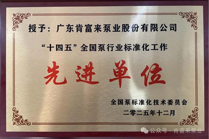 肯富来泵业荣获“十四五”全国泵行业标准化工作先进单位,并被授予牌匾。“十四五”期间,泵行业面临着转型升级与高质量发展的双重挑战。肯富来泵业积极响应国家号召,投入资源开展标准研究与创新,推动行业技术进步与产业升级。这一荣誉是对肯富来泵业在“十四五”期间标准化工作成果的高度认可,也是激励肯富来泵业继续在标准化领域深耕细作、勇攀高峰的强大动力。