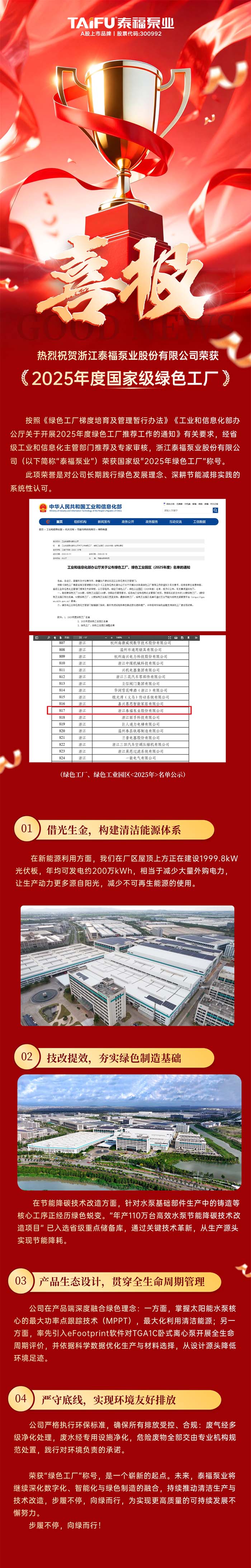 喜报!泰福泵业荣获“2025年度国家级绿色工厂”称号!