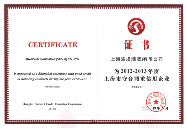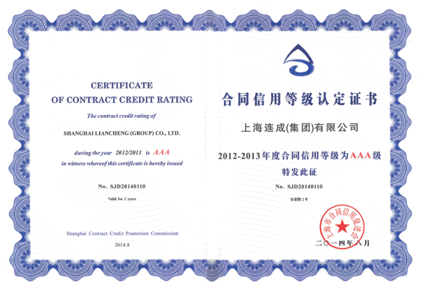 日前,经上海市工商行政管理总局、上海市合同信用促进会严格评估,连成集团再次荣获2012-2013年度“上海市守合同重信用企业”称号,同时公司合同信用等级再次问鼎最高级别“AAA级”。