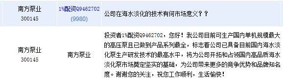 南方泵业(300145)周一上午在全景网互动平台表示,公司目前可生产国内单机规模最大的高压泵,且已做到产品系列最全,标志着公司已具备目前国内海水淡化泵生产研发技术的最高水平,将为公司开拓和占领国内高品质海水淡化泵市场奠定坚实的基础,为公司带来更多的竞争优势和品牌知名度。