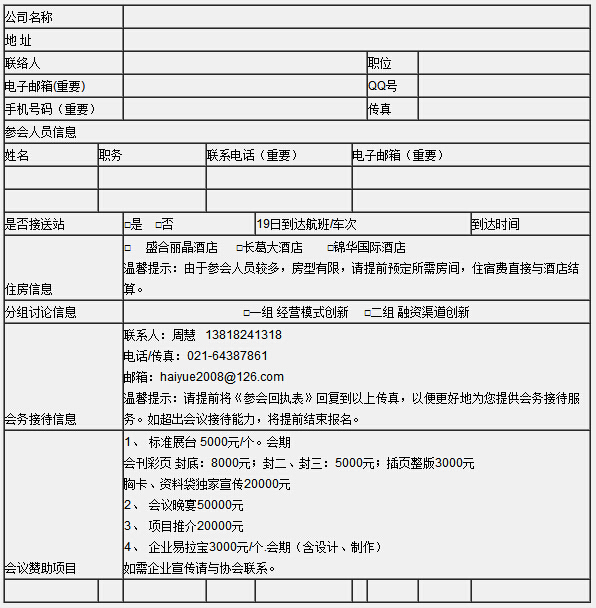 请将《报名回执》回复到haiyue2008@126.com邮箱或以上传真,以便更好地为您提供会务接待服务。