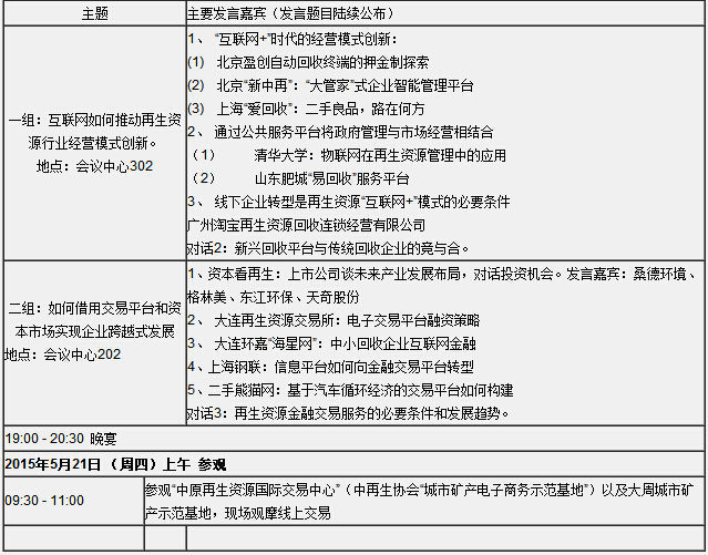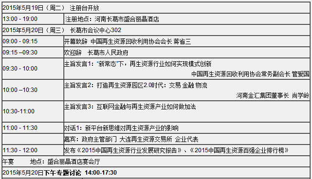 为分享交流行业先行者的创新经验,推动行业发展,中国再生资源回收利用协会定于2015年5月19日~21日在河南长葛大周国家城市矿产示范基地召开“互联网+”时代,再生资源产业创新发展论坛。