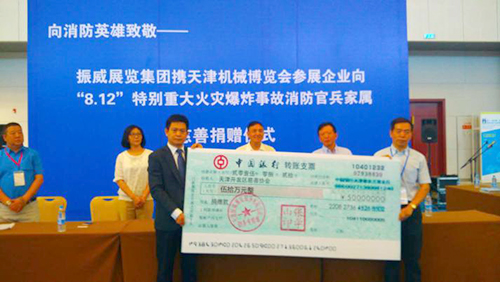 天津港“8•12”特别重大火灾爆炸事故发生后,英勇无畏的消防战士用他们的血肉筑起了生命通道。社会各界纷纷伸出援手,向在此次事故中牺牲的消防官兵及家属表达敬意和哀悼。8月21日,第十一届天津机博会闭幕,中国国际商会、中国会展经济研究会、天津会展行业协会、振威展览、上海普盈贸易、中宝物流、无锡庆源、集发源机械贸易、定兴肇兴、日泰寿海、大族激光等相关主办机构与参展企业在展会现场举办捐赠仪式,共向遇难消防官兵家属捐款近百万元。