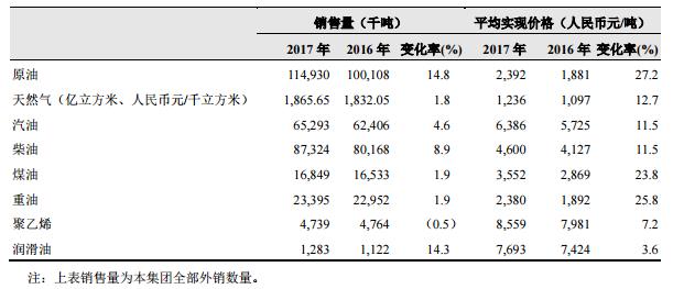 中国石油2017年及2016年主要产品对外销售数量、平均实现价格以及各自的变化率。本文表格均来自中国石油2017年度报告