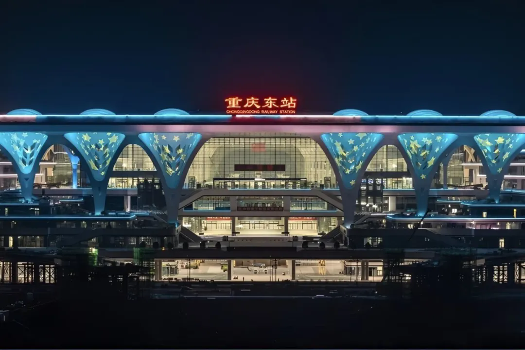 重庆东站是国家“八纵八横”高铁网的重要交会点,接入渝厦、渝万、成渝、渝贵、渝昆等多条高铁线路及枢纽东环线,站场规模达3场15台29线,总建筑面积约122万平方米,是全国首批“交通强国”站城一体化试点工程。