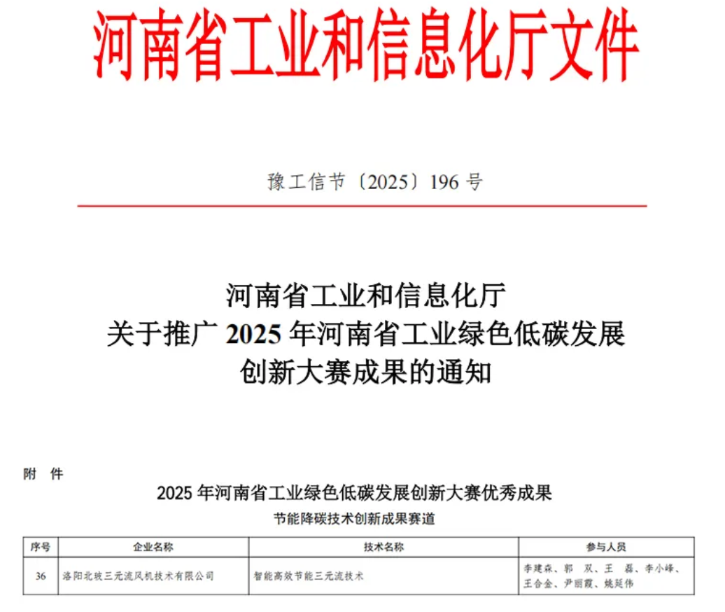 近日,河南省工业和信息化厅正式公示2025年河南省工业绿色低碳发展创新大赛获奖名单,洛阳北玻三元流风机技术有限公司凭借自主研发的 “智能高效节能三元流技术” ,在竞争激烈的节能降碳技术创新成果赛道中脱颖而出,成功斩获优秀奖,为企业绿色创新之路再添里程碑。