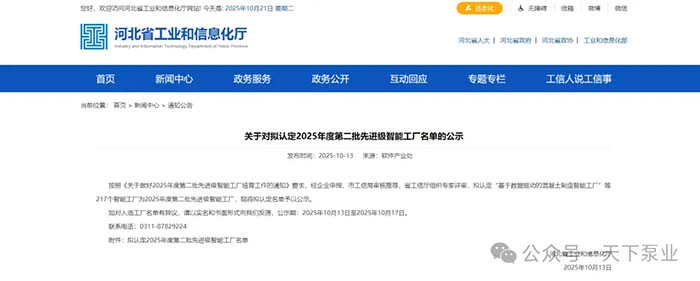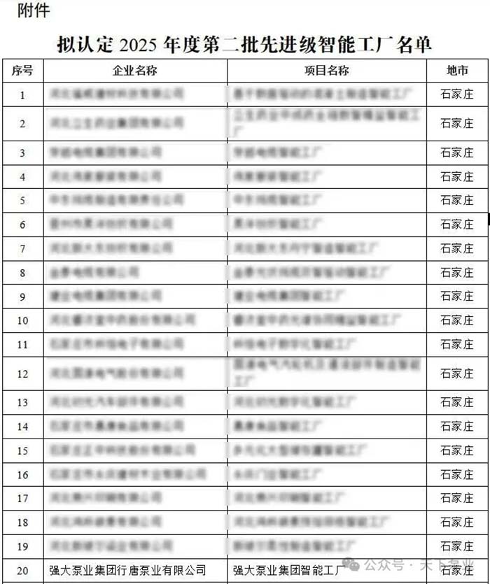 10月13日,河北省工业和信息化厅发布《关于对拟认定2025年度第二批先进级智能工厂名单的公示》,公示日期为10月13日-17日。公示通过,强大泵业集团行唐泵业有限公司被认定为2025年度第二批先进级智能工厂。