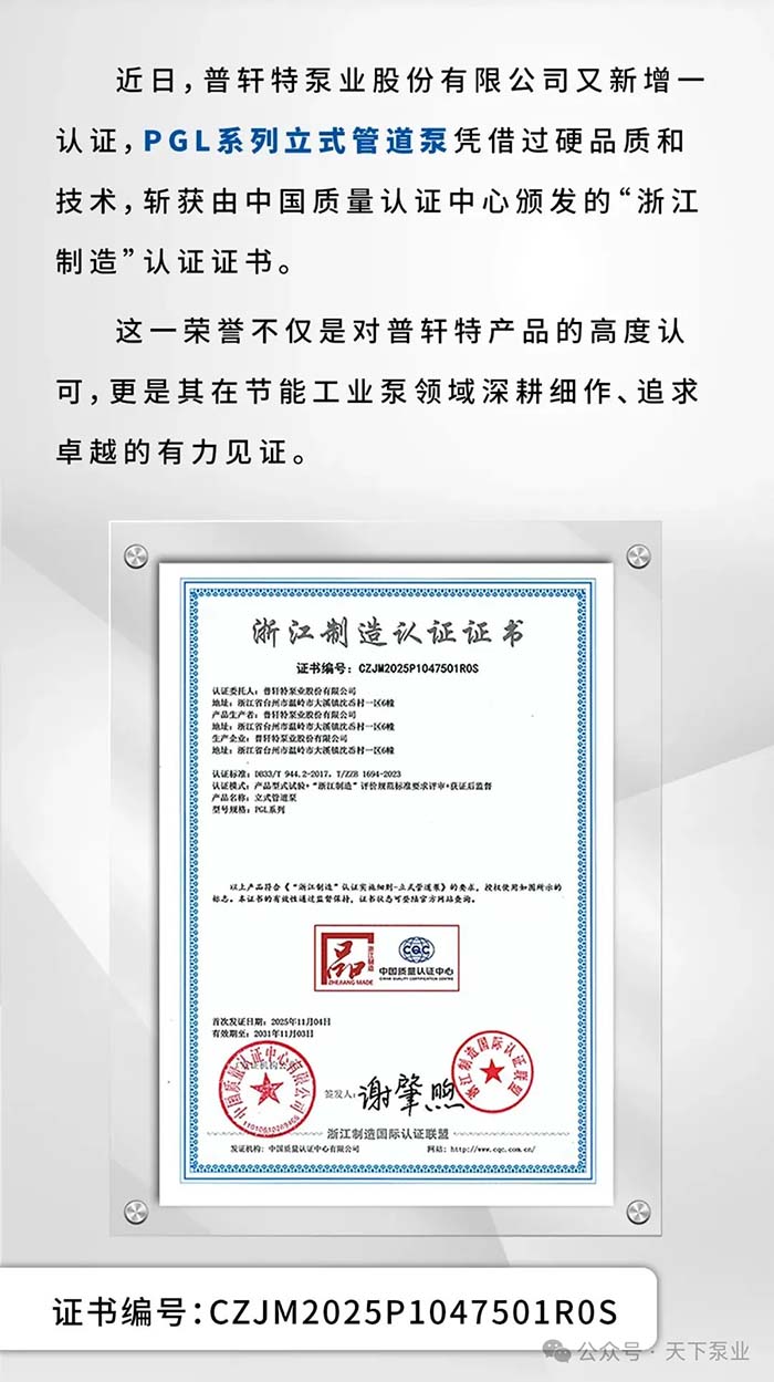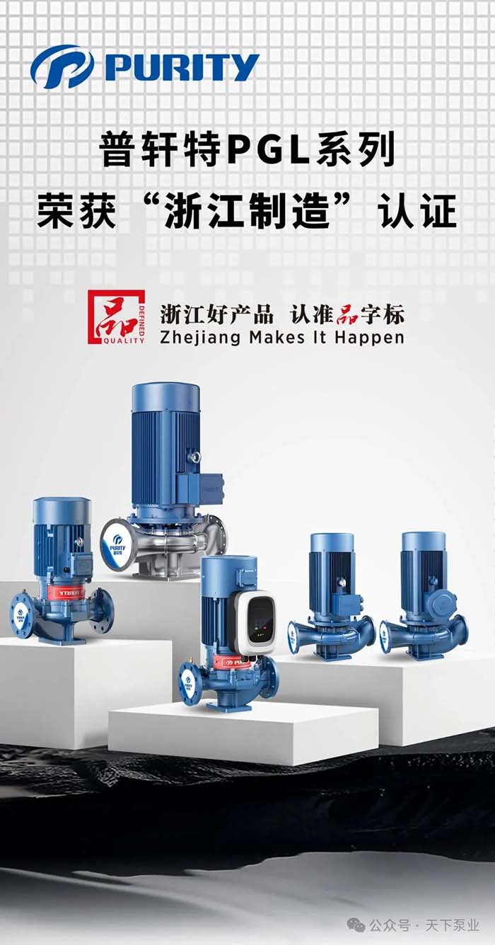 >普轩特泵业荣获“浙江制造”认证,立式管道泵再树行业品质标杆!