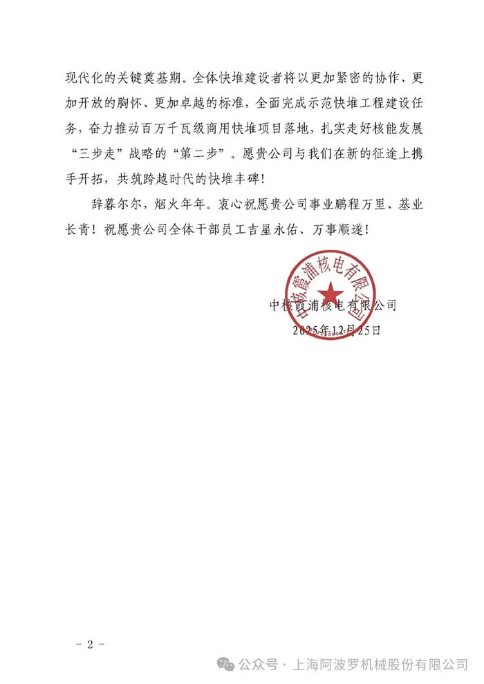 近日,上海阿波罗机械股份有限公司收到一封来自中核霞浦核电有限公司发来的感谢信,对阿波罗在二回路主循环钠泵项目中所表现出的专业能力和工作态度给予高度评价。