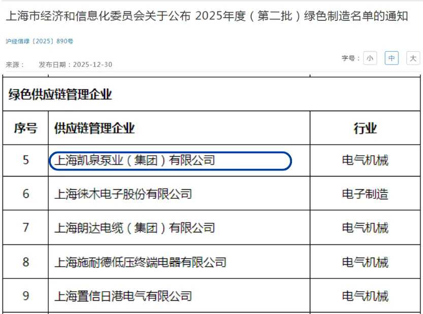 近日,上海市经济和信息化委员会公示了2025年度绿色供应链管理企业名单,凯泉凭借在绿色供应链体系建设中的卓越实践与显著成效成功入选。