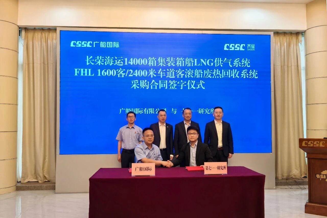 4月9日,中船七一一所下属上海齐耀科技集团有限公司(以下简称“齐耀科技”)与中船广船国际有限公司(以下简称“广船国际”)签署两项重要采购合同,分别涉及长荣海运14000箱集装箱船LNG供气系统,以及FHL 1600客/2400米车道客滚船废热回收系统。
