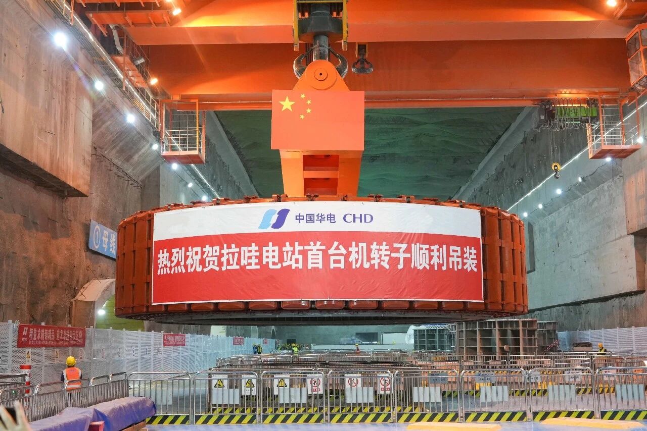 拉哇水电站位于四川省巴塘县与西藏自治区芒康县交界的金沙江干流,是国家“十五五”规划重点建设的金沙江上游水风光一体化基地重要组成部分,总装机容量200万千瓦。本次吊装的转子直径13.43米,高3.10米,总重量约1007吨,是拉哇水电站机组重量最大的部件。