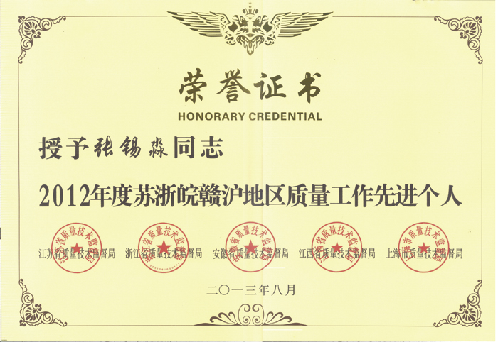 近日,由江苏省、浙江省、安徽省、江西省和上海市质量技术监督局联合发文《关于表彰2012年度苏浙皖赣沪地区质量工作先进个人的决定》,集团董事长张锡淼荣获“2012年度苏浙皖赣沪地区质量工作先进个人”。