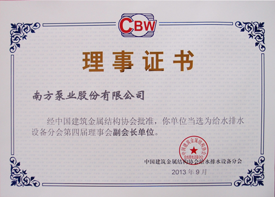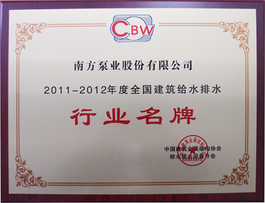 2013年9月24日,在上海召开的中国建筑金属结构协会给水排水设备分会第四次会员代表大会上,南方泵业股份有限公司被提名并成功当选为给水排水设备分会副会长单位,同时被评为“2011-2012年度全国建筑给水排水”行业名牌。