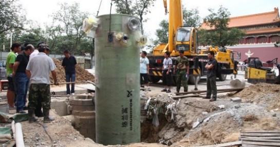 2013年6月20日上午,一台高4.4米、直径1.2米的格兰富预制泵站在天安门内顺利安装,