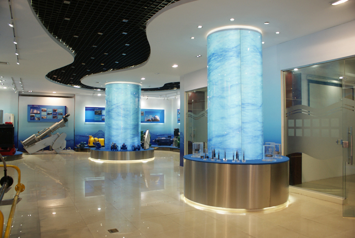 连成集团总部样品展示厅主要包括企业简介、企业文化、企业荣誉、连成大事记和产品展示等几个板块。展厅设计构思立意深远,把“水”的哲理完美地融入了连成的企业文化和管理理念,展厅入口处动态水槽源源不断流动着的水与公司致力于人类流体处理工业的宗旨巧妙衔接;展品内容丰富,共罗列了建筑用泵、消防用泵、环保产品、化工用泵、工矿用泵、水利用泵和市政用泵七个品种,20多个不同系列的产品,尽可能全面清晰地展示集团公司旗下的各类产品。展厅设计以蓝色为主基调,每块区域造型独特,色彩丰富,再配以不同的灯光效果,使展厅整体设计充满了现代感,打破了工业设备以往的严谨与沉闷,给人耳目一新的感觉,更好的体现连成作为国内一流流体处理工业企业的形象,以及可持续发展的企业发展理念。