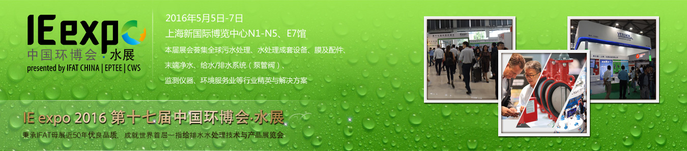 IE expo 2016第十七届中国环博会·水展于2016年5月5-7日在上海新国际博览中心举行。本届展会将荟集全球污水处理、水处理成套设备、膜及配件、末端净水、给水/排水系统(泵管阀)、监测仪器、环境服务业等行业精英与解决方案,展会同期还将举办中国环博会高峰论坛,来自政策制定部门、科研院所、领先技术企业的百余名业内顶级专家全程参与200多场专业会议论坛,致力于打造一个政、产、学、研一站式环境技术交流平台。