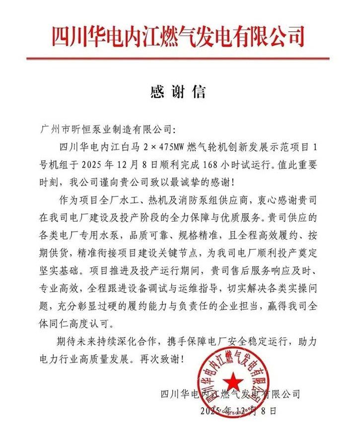 昕恒泵业获四川华电内江燃气发电有限公司感谢信!