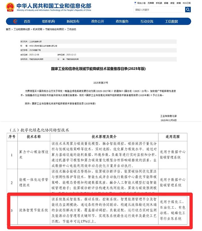近日,国家工信部正式发布《国家工业和信息化领域节能降碳技术装备推荐目录(2025年版)》。嘉和科技自主研发的“流体智慧节能系统(JECO)”凭借突出技术创新性与显著节能降碳效益,成功入选。这不仅是对嘉和科技研发实力的高度认可,更是对公司持续推动制造业数字化绿色化转型实践的重要肯定。