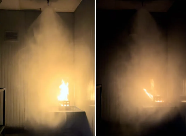 高压细水雾燃烧实验室模拟火灾现场喷放对比