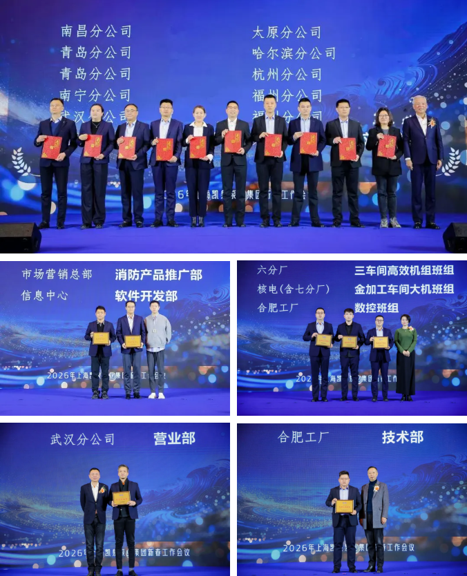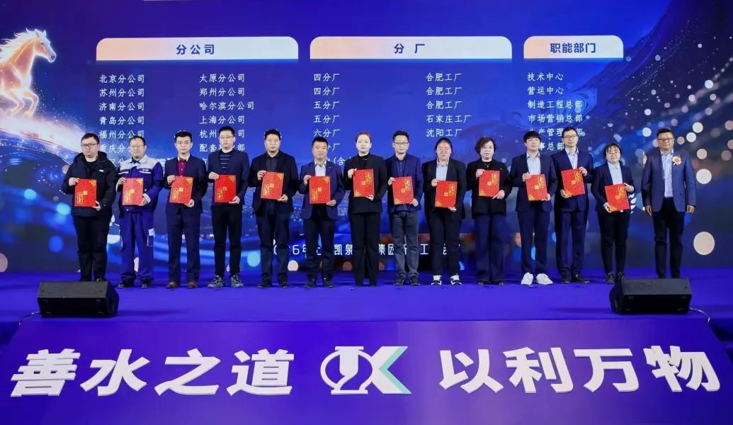 会上还对 2025 年度表现突出的先进个人与集体进行隆重表彰,先后颁发数十个奖项,同时邀请四位获奖代表依次上台分享心得,多角度展现了凯泉人实干担当、奋勇争先的精神风貌,为全体同仁树立了学习榜样。