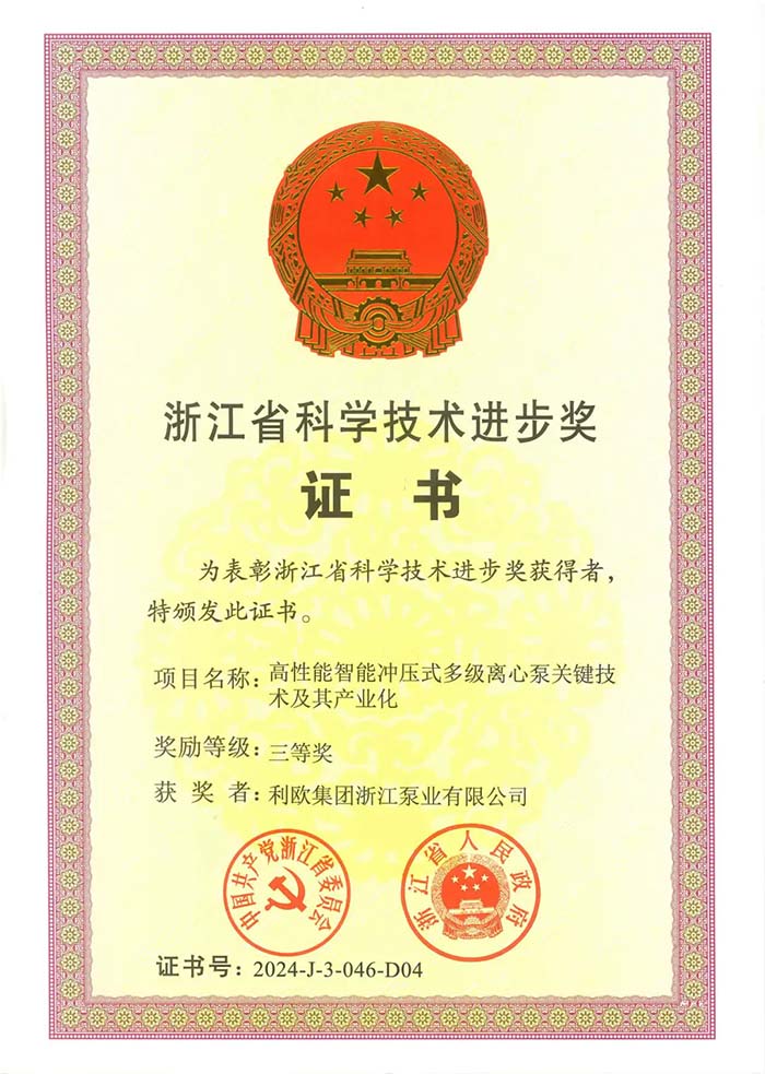 2月9日,全省建设一流创新生态打造最具竞争力营商环境大会在杭州举行。大会表彰了2024年度浙江省科学技术奖,其中由利欧泵业参与的“高性能智能冲压式多级离心泵关键技术及其产业化”项目,荣获浙江省科学技术进步奖三等奖。