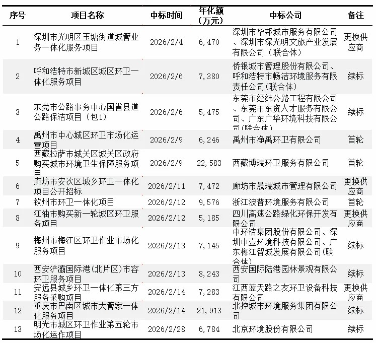 2月14日,北控城市环境服务集团有限公司中标重庆市巴南区城市大管家一体化服务项目,成交额65,738万元(3年),成功完成续标。