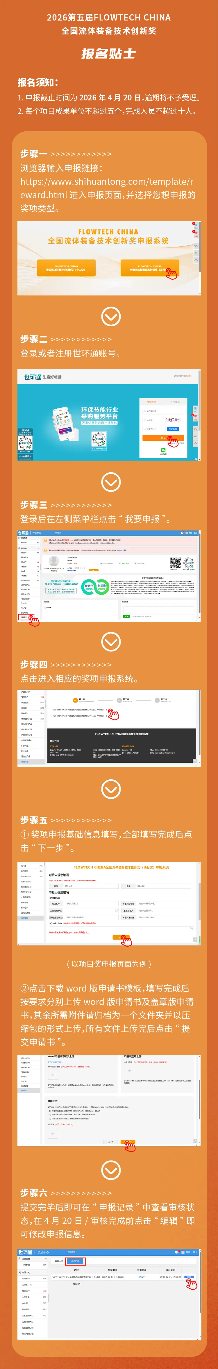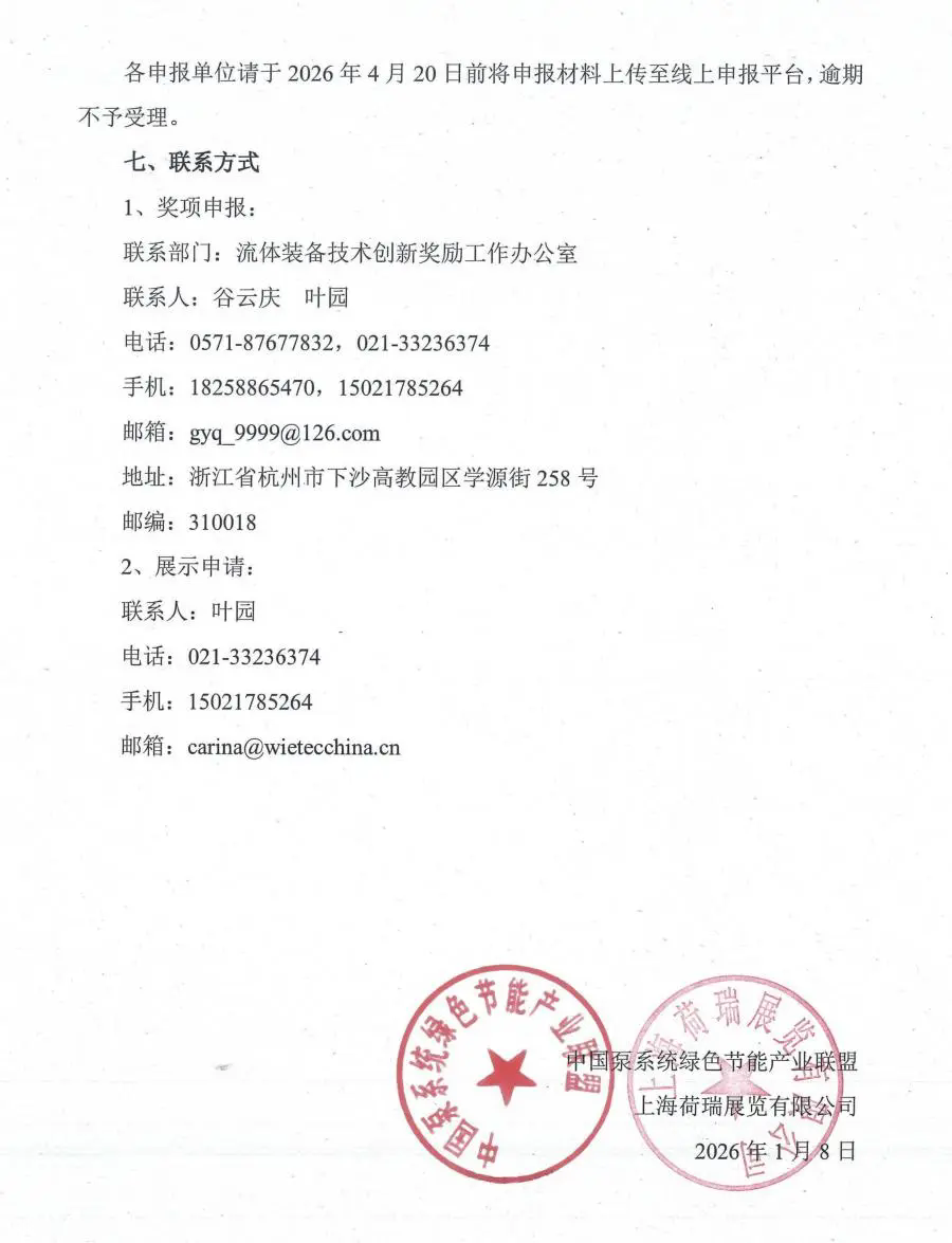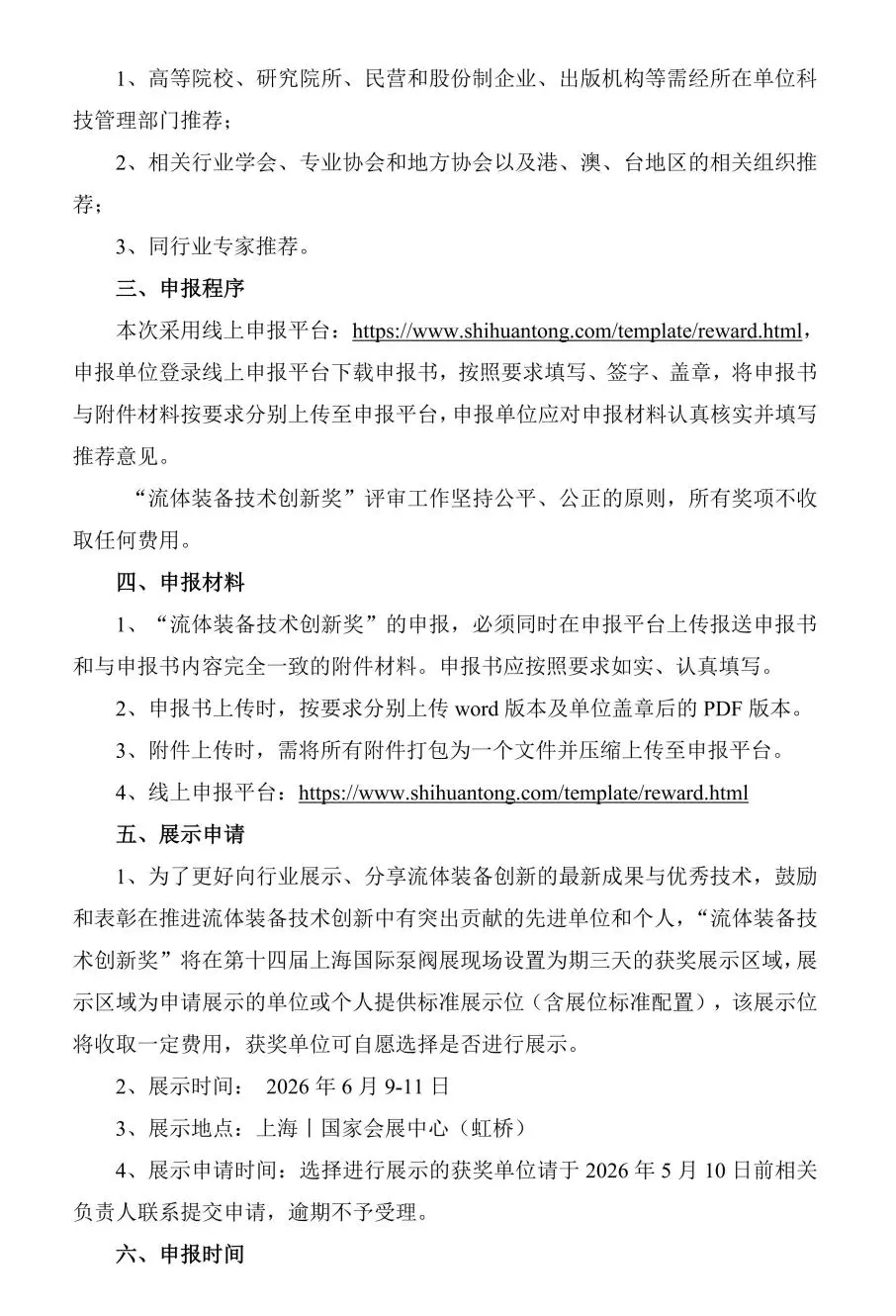 “流体装备技术创新奖”评审工作坚持公平、公正的原则,所有奖项不收取任何费用,各申报和推荐单位请于2026年4月20日前将申报材料上传至指定网站,逾期不予受理。