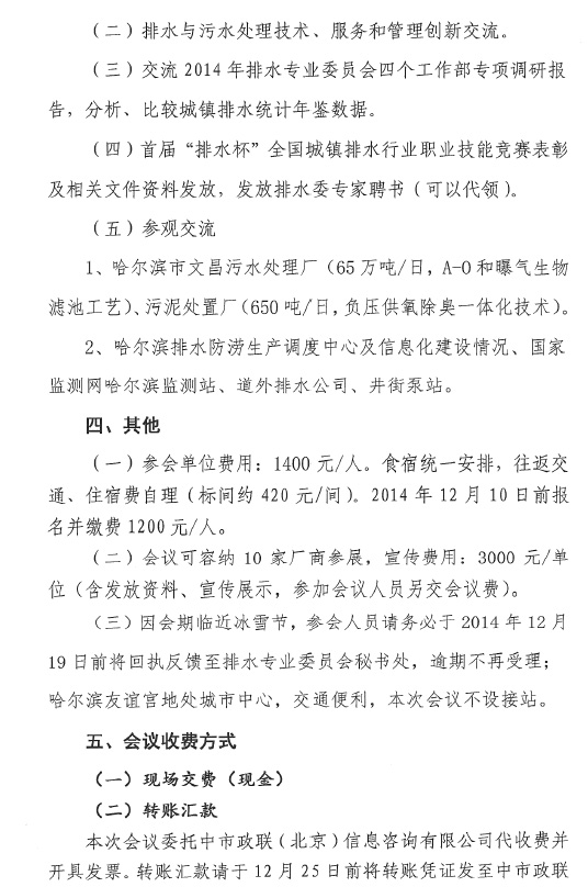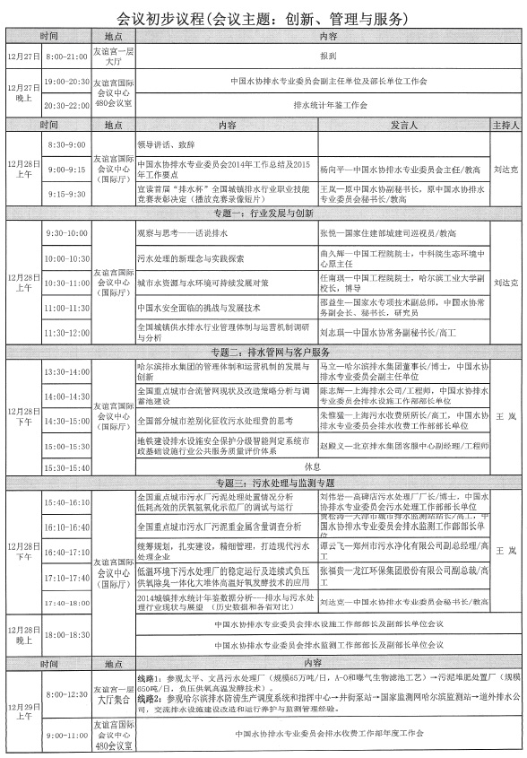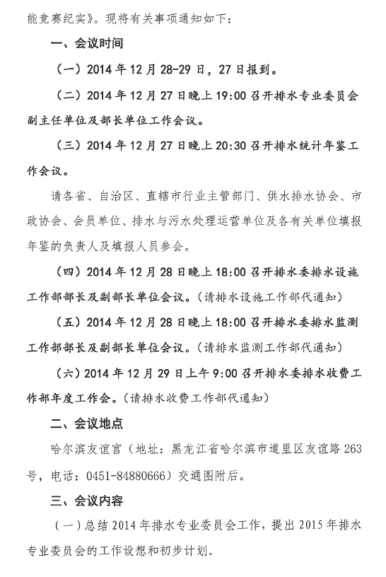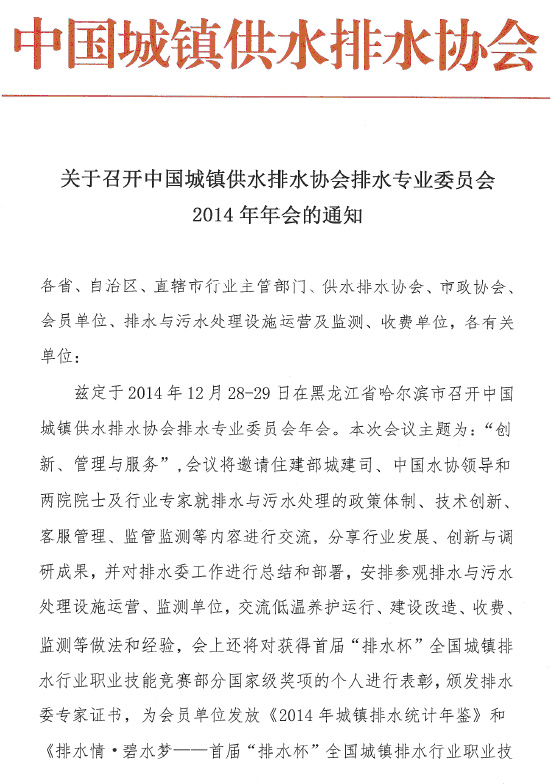 中国城镇供水排水协会排水专业委员会2014年年会将于12月28-29日在黑龙江省哈尔滨市召开,会议主题为:“创新、管理与服务”,届时大会将邀请住建部城建司、中国水协领导和两院院士及行业专家就排水与污水处理的政策体制、技术创新、客服管理、监管监测等内容进行交流,分享行业发展、创新与调研成果,并对排水委的工作进行总结和部署,安排参观排水与污水处理设施运营、监测单位,交流低温养护运行、建设改造、收费、监测等做法和经验,会上还将对获得首届“排水杯”全国城镇排水行业职业技能竞赛部分国家级奖项的个人进行表彰,颁发排水委专家证书,为会员单位发放《2014年城镇排水统计年鉴》和《排水情•碧水梦——首届“排水杯”全国城镇排水行业职业技能竞赛纪实》。
