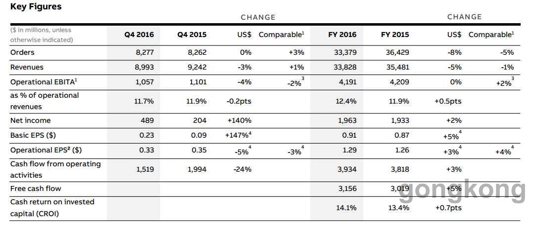 ABB发布第四季和2016全年业绩报告 净利润增长2%