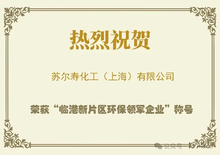 苏尔寿化工(上海)有限公司2025年荣获了中国(上海)自由贸易试验区临港新片区管理委员会发布的“临港新片区环保领军企业”称号。