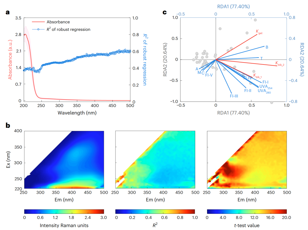(a)UV-vis光谱均值-标准差谱及吸光度与凝胶层污染潜势(Kgel)之间的逐点扫描稳健回归R2;