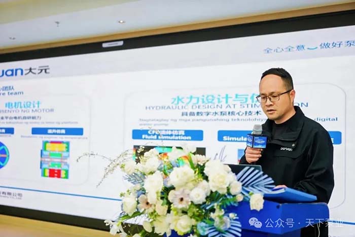 会上,研发部部长王于宽带来大元技术核心优势和新品介绍的精彩分享。他首先介绍了大元研发团队的实力,随后详细介绍了多款重磅新品,包括FP元宝智能永磁屏蔽式增压泵、Cm-Y大流量离心泵、ZQX直流田园泵、WQ/D-C雷霆切割泵及多款井泵系列新品,充分展示了大元在不同应用场景下的技术布局。菲律宾经销商对新产品表现出浓厚兴趣,纷纷拍照记录。
