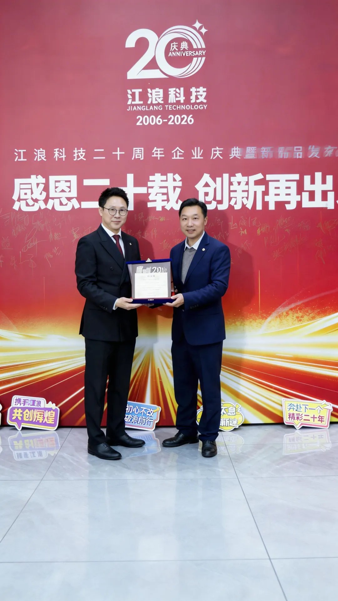 值此二十周年庆典之际,我们特别感谢创始人陈伯琴先生的远见卓识,感谢每一位员工的辛勤付出,感谢所有合作伙伴的信任支持,感谢各级政府的关怀指导。中共江浪科技股份有限公