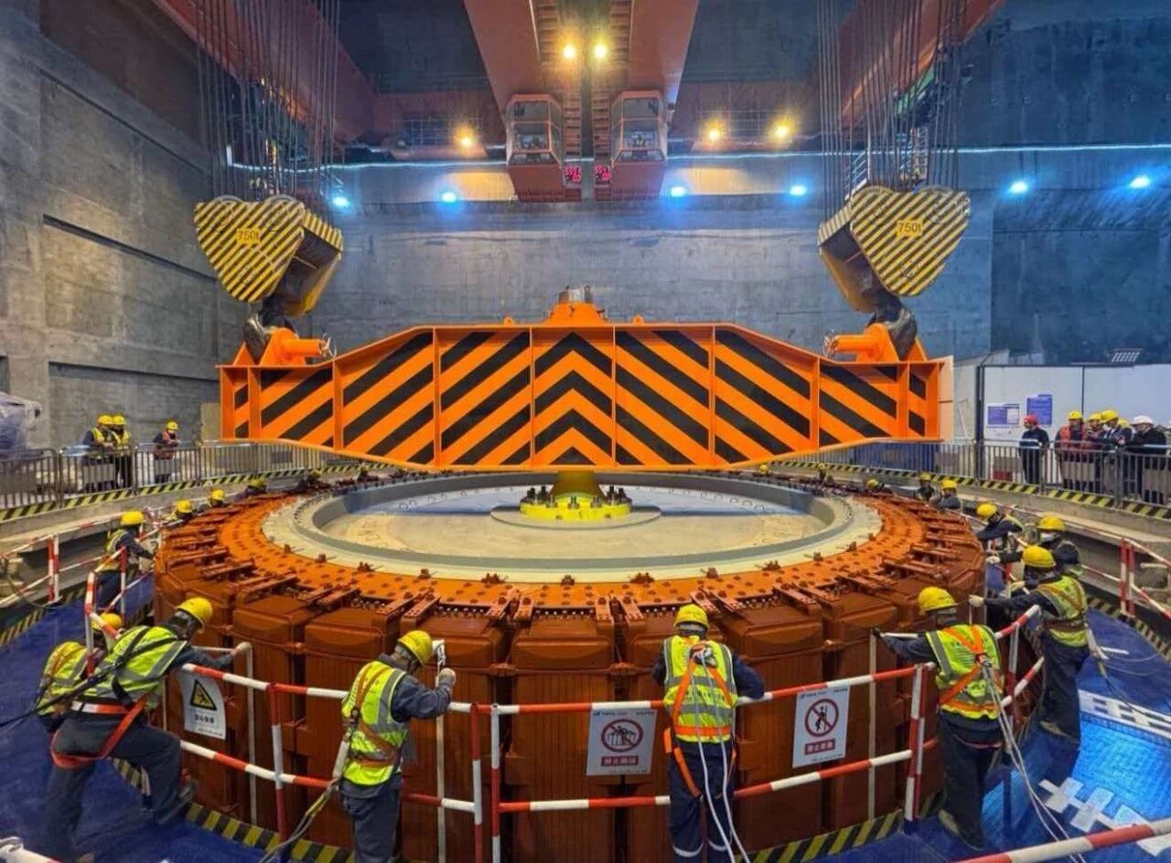 拉哇水电站位于四川省巴塘县与西藏自治区芒康县交界的金沙江干流,是国家“十五五”规划重点建设的金沙江上游水风光一体化基地重要组成部分,总装机容量200万千瓦。本次吊装的转子直径13.43米,高3.10米,总重量约1007吨,是拉哇水电站机组重量最大的部件。