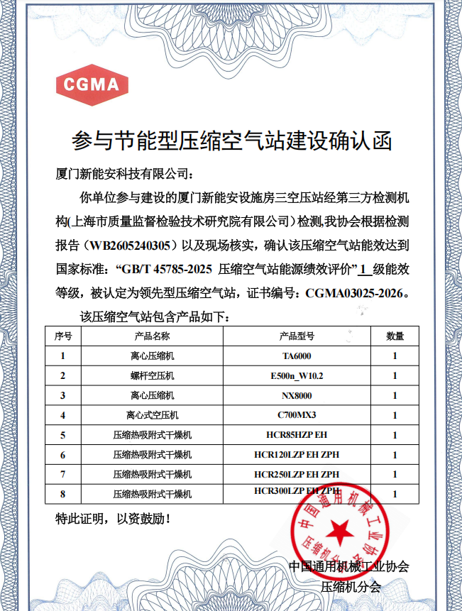厦门新能安设施房三空压站获能效评级一级!
