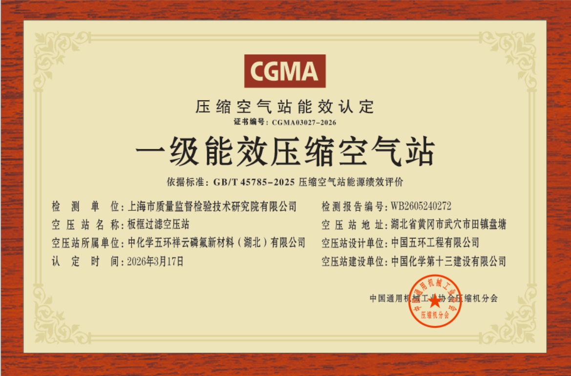 中国化学第十三建设有限公司板框过滤空压站经第三方检测机构(上海市质量监督检验技术研究院有限公司)检测,我协会根据检测报告(WB2605240272)以及现场核实,确认该压缩空气站能效达到国家标准:“GB/T45785-2025 压缩空气站能源绩效评价” 1 级能效等级,被认定为领先型压缩空气站,证书编号:CGMA03027-2026。