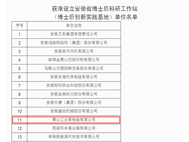 RSP黄泵获准设立安徽省博士后科研工作站,安徽省为加大引进、培养和使用高层次专业技术人才的工作力度,进一步发挥博士后制度在推进我省自主创新、加快技术进步方面的重要作用,根据有关文件精神,经专家评审,决定批准黄山工业泵制造有限公司等35个单位设立安徽省博士后科研工作站(博士后创新实践基地),开展博士后工作。
