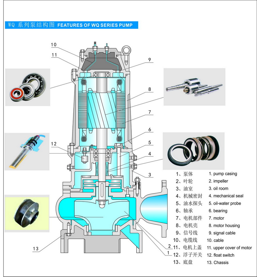 WQP型不锈钢排污泵由电机与泵两部分组成,二者通过油隔离室及机械密封组件隔幵,属机电一体化产品, 电机与泵合用同一轴(转子)整个水泵长度短,结构紧凑。配备多种 保护装置,使得泵运行安全可靠。其主要部件作用如下: