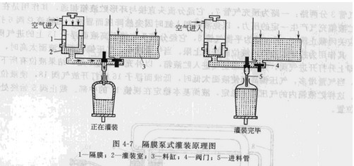 下图4-7所示为隔膜泵式定量灌装的原理图。料缸压力一般保持在0.11MPa以下。在气压作用下.液体流人灌装室2中。灌装室充满后,通向料缸3的阀门4关闭.防止回流.然后启通容器方向.空气压力作用在柱塞上,柱塞将隔膜压下.迫使液体流人容器。灌装完毕加在隔膜上的气压释放。阀门换向,再次从料缸吸料。在瓶劲导向装置上装有“无容器不灌装”机构,该机构只有接触到容器时才能触动气源控制系统。使气流推动隔膜运动。
